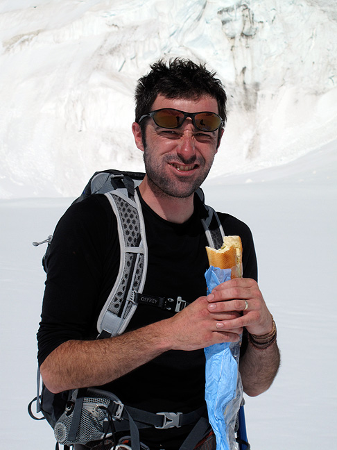 Back down on the lower glacier, Matt has time to eat his sandwich, which appears to have been left too long in the bottom of his pack. |