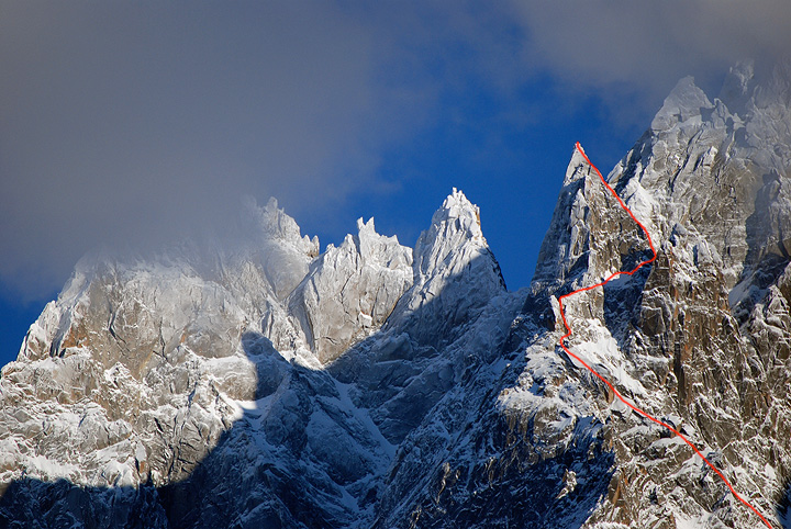The evening after our Entrèves traverse it rained quite hard. However, an improving forecast suggested that the rock on the Aiguille du Peigne might be just dry enough for an ascent. We chose the Eperon Minettes, finishing with the normal route. On the Eperon section the rock was just barely dry, but up higher was sun-warmed and wonderful. This photo was taken in late November of 2008. I simply did not have one of more recent vintage which showed the peak. |