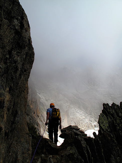 Our first day was decidedly cloudy. Our original hope was to do the Salluard Route on the NW Face of the Aiguille d'Entrèves. However, in the persistent fog it was simply too hard to find! (I had never done this route before). So we opted for the Traverse instead - probably a good thing as light snow started to fall just as we finished. Here, John enjoys a short "à cheval" section of the route. |