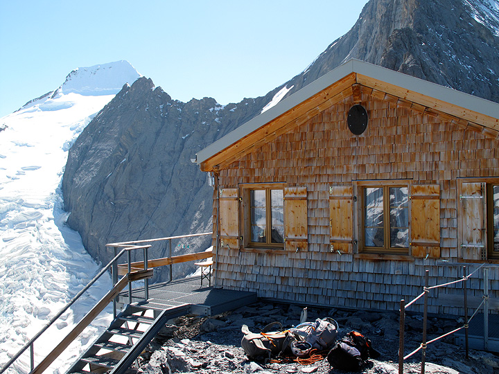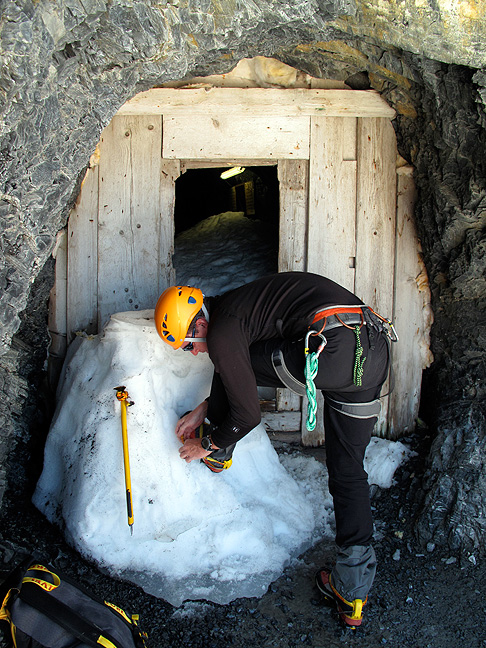With a great weather forecast, we decided to go for the Mittellegi Ridge of the Eiger. The climb starts with the Jungfraujoch railway, taken as far as the Eismeer station. A "secret" door marks the start of an icy tunnel and the exit onto the glacier below. |