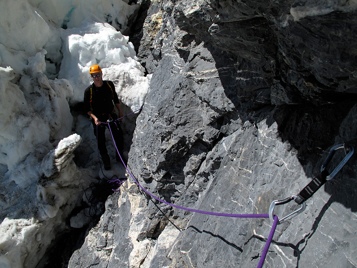 Rappelling back down into the Papillons Couloir. |