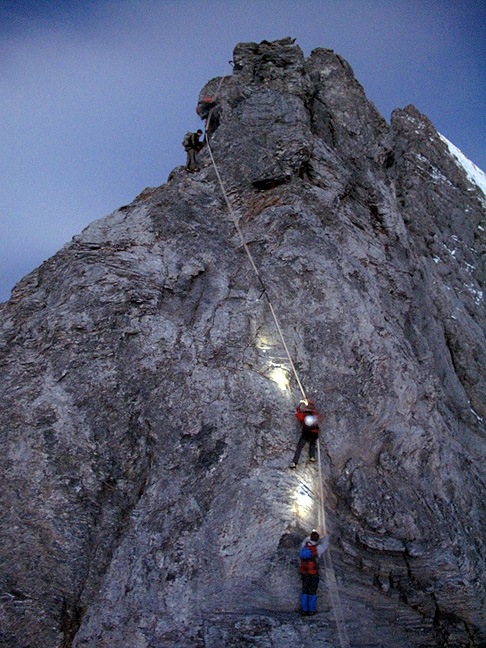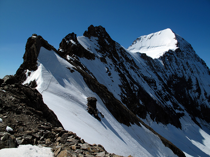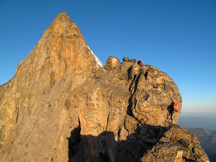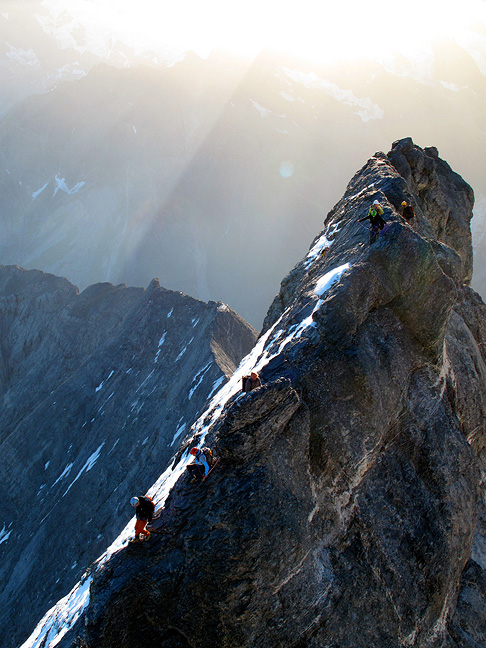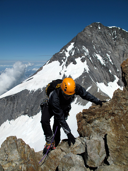 The preferred descent is usually via the South Ridge, a long and complicated affair, usually taking longer than the ascent itself. In this photo we are looking toward the Mönch, and the towers over which we'll need to climb. |