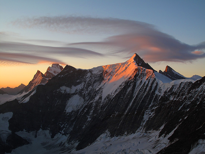 Sunrise reveals lenticular clouds over the Fiescherhorns and the Finsteraarhorn. |