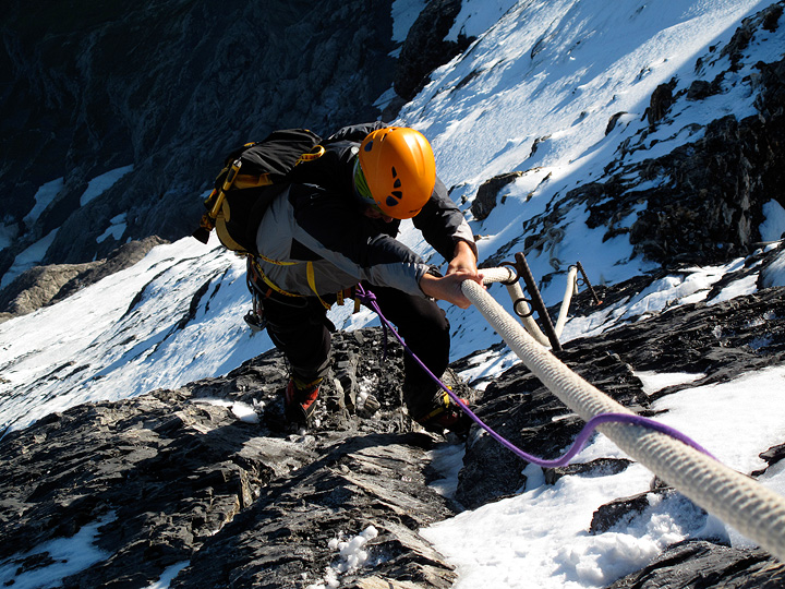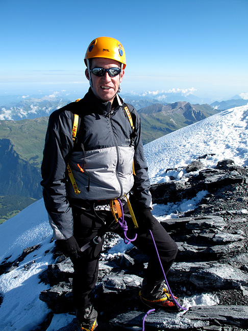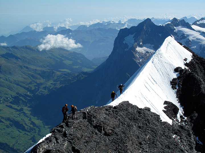 Just below the summit the rock gives way to snow, with some decidedly airy traverses above the North Face. Grindelwald lies far down in the valley below. |