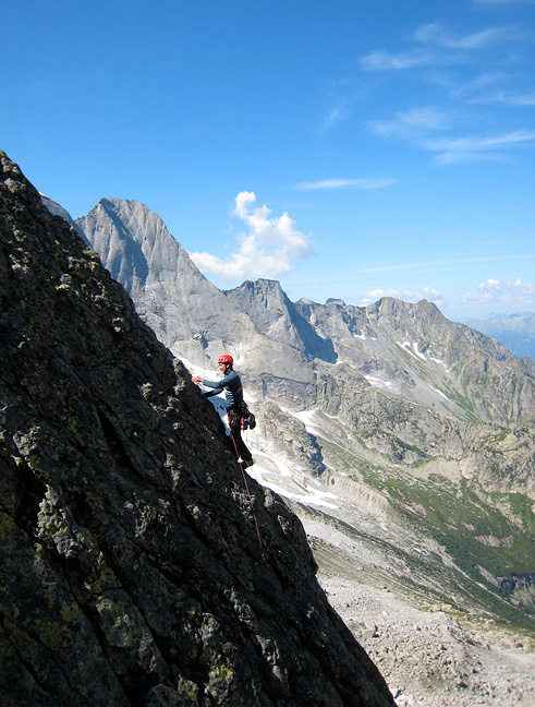 A shorter following day on the Innominata, and then back to the valley. A climber jogs up the ridge, Piz Badile in the background. |