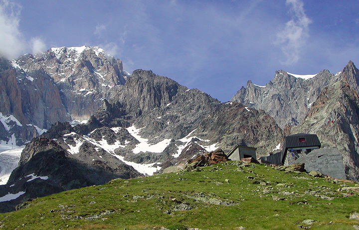 And for the last part of our "Super Trilogy" the Innominata Ridge on Mont Blanc. We opted for a 2-day schedule, with the first including a long (7500 foot) climb up to the Eccles bivouac hut, and the next up and over and hopefully down. Due to a camera image downloading problem, I don't have any photos of the climb up to the hut. However, this one, taken some 5 years earlier, shows the Monzino hut (reached in about 2h30 from the car park) on the right, and Mont Blanc towering above on the left. |