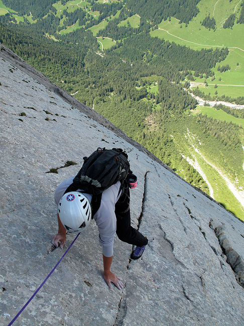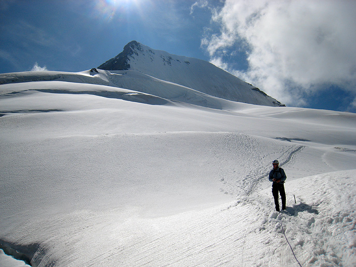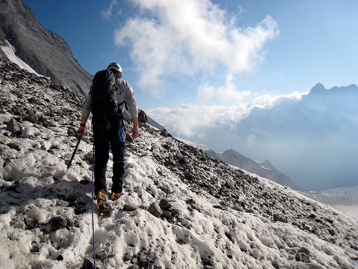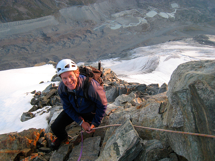 We reach the edge of the glacier and start the rock pitches that lead to easier climbing and the Mittellegi hut (which we'll bypass). |