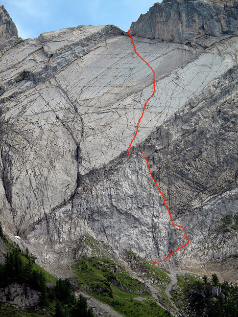 The big slab of limestone which is the Miroir. The Directe route, the one we did, shown. |