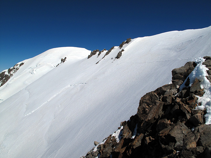 We have finally reached the Brouillard Ridge, with only easier climbing between us and the summit. The Swiss guide and client just ahead of us. |