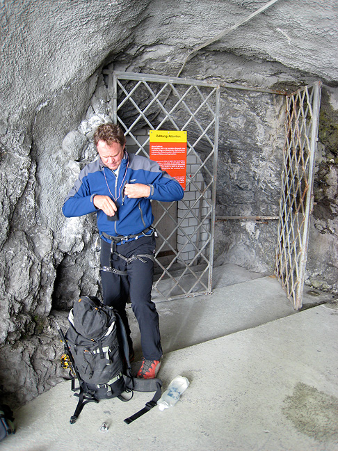Catching the 7:30 train from Grindelwald as the start of a big alpine route felt odd, indeed. And once we step off the train in the Eismeer station, the strangeness continues, with a walk down an icy tunnel and then out on to the glacier. Grant prepares the kit for the exit into the alpine world. |