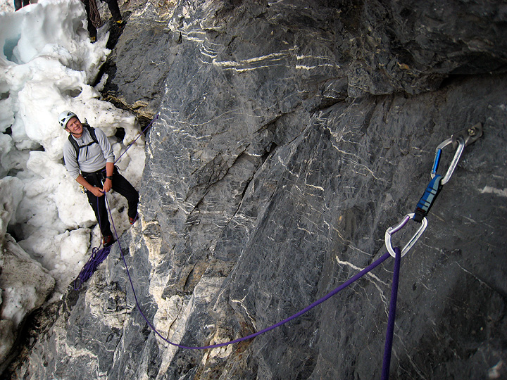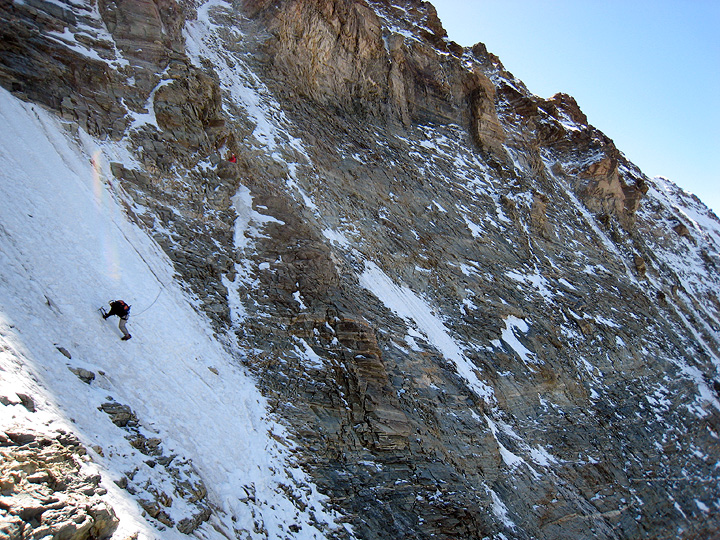 Rising at a very early 2 am we climbed for quite a while in the dark, traversing under the Matterhorn's North Face and gaining the rotten rock rib (dropping below Grant in this photo) that leads up to the actual crest of the Zmutt Ridge. I'm not sure why this little piece of fixed rope is here, it served no useful purpose. |