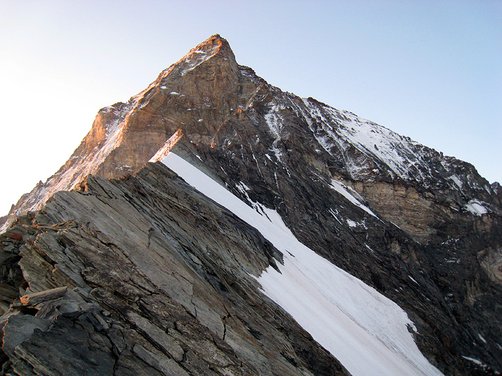 Arriving on the crest of the Mittellegi ridge after only an hour's travel. The view up the ridge ahead. |