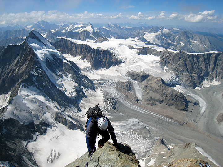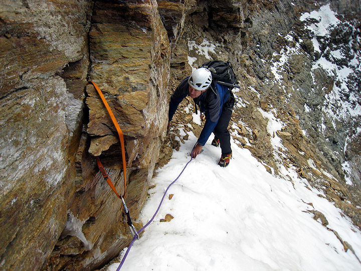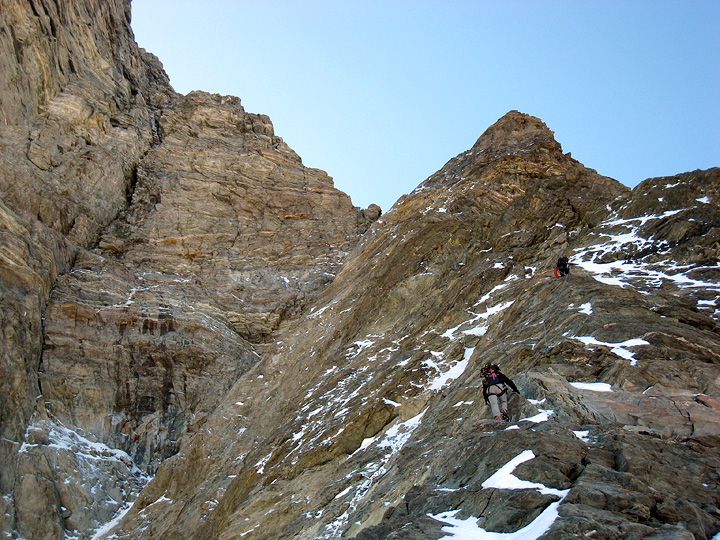 There were 2 other climbers on the route with us, Sammy, a guide from Engelberg, and Martin, a long-time client/friend. In this photo, we are looking up from a point just having passed the Zmutt Teeth, a series of pinnacles. The rock here is actually much snowier than it would appear, slowing progress greatly. |