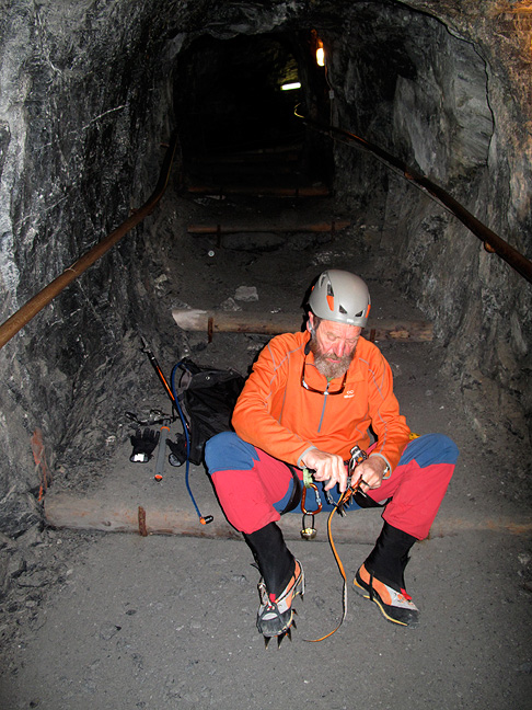 And now for something completely different. After a short break, Mike joins Mark for our first climb, the Eiger's Mittellegi Ridge. The start is indeed odd. Exiting the Jungfraujoch railway at the Eismeer station, we walk down an icy tunnel to pop out onto the glacier below. |