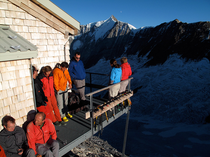 Climbers at the Mittellegi hut enjoy the last warmth of the sun. |