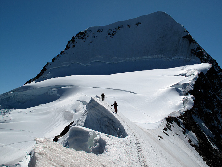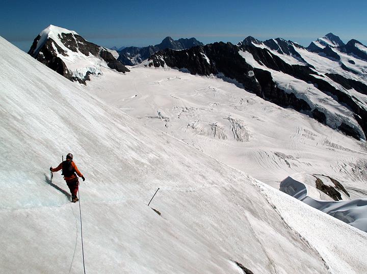 An icy traverse leads to easier climbing and a quick descent back to the Jungfraujoch. |