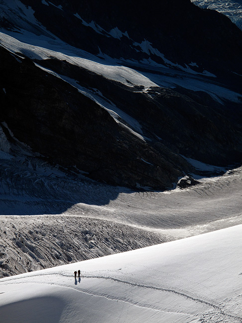 Finally, easier climbing and the glacier walk back to the Mönchsjoch hut. The North Face of the Mönch in the background. |