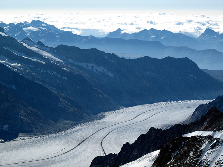 The view to the southeast, down the Aletsch Glacier. |