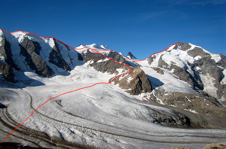 The red line shows Mike and Kathy's program for the first few days. We met up early in the morning to take the first cable car to the Diavolezza hut, then carried on up the glacier to the Marco e Rosa hut via the Fortezza (the first left-ward jog of the line, following the rock ridge). |