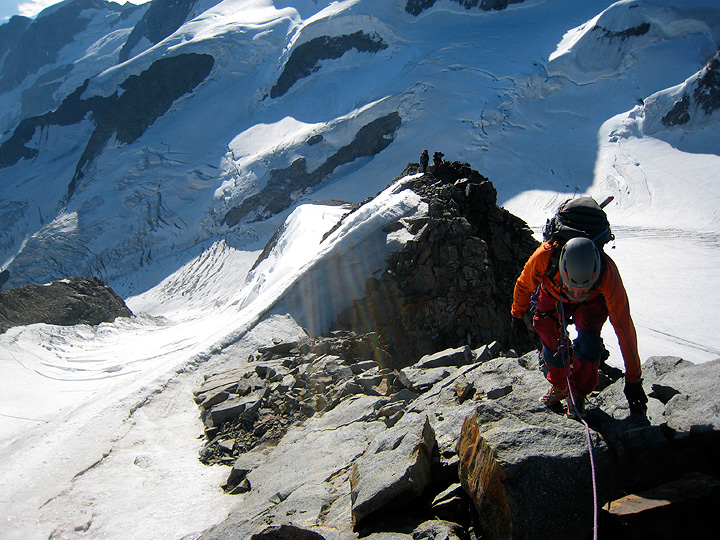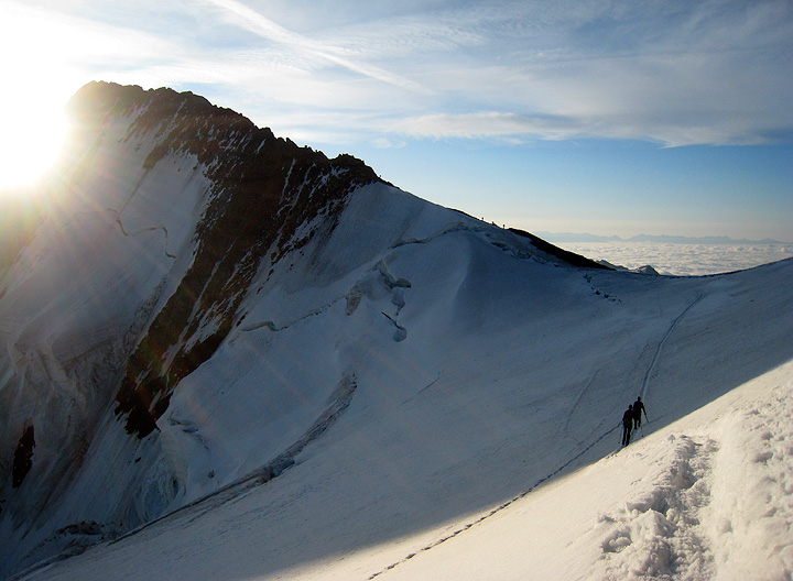 A couple of other climbers precede us down the snow and ice ridge. |