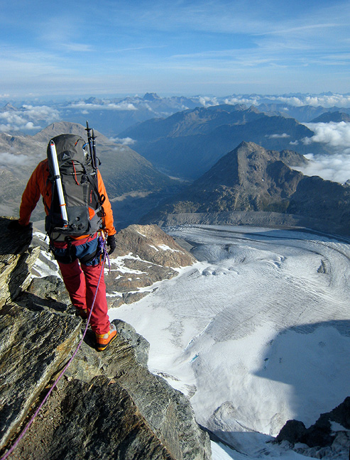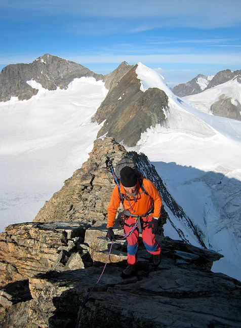 The descent of the South Ridge takes longer than the climb of the Eiger. Here, we traverse one of the many towers between the Eigerjoch and the easy glacier below the Mönch. |