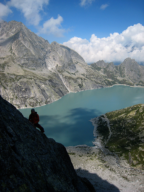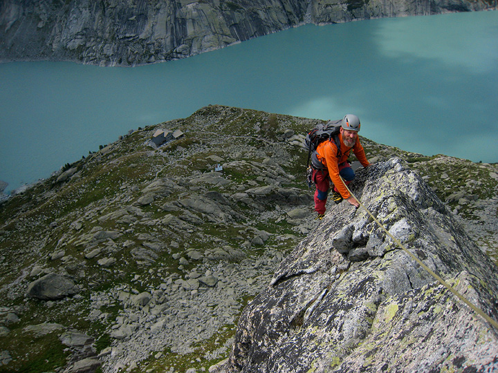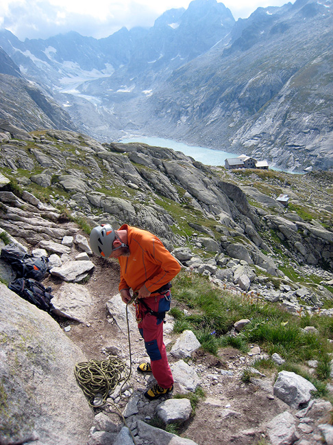 Mike getting ready for the next pitch, above Albigna lake. |