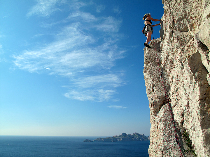 There are also many inland routes of a more traditional sport climbing nature. Here Kathy is on a route at Colline de Lun, near Sormiou. |
