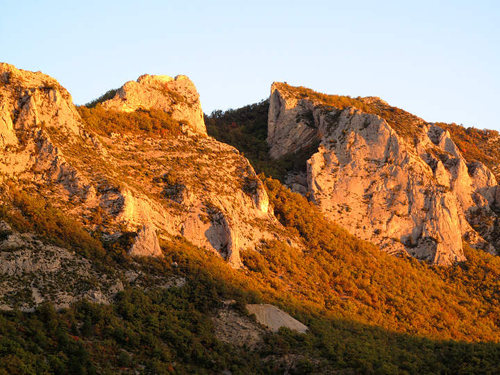 A few of the limestone cliffs of Orpierre. Though the rock looks a bit scruffy, it is studded with both holds and bolts. There are hundreds of routes here, nearly all of the well-bolted, and many in the easier grades. |