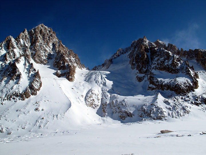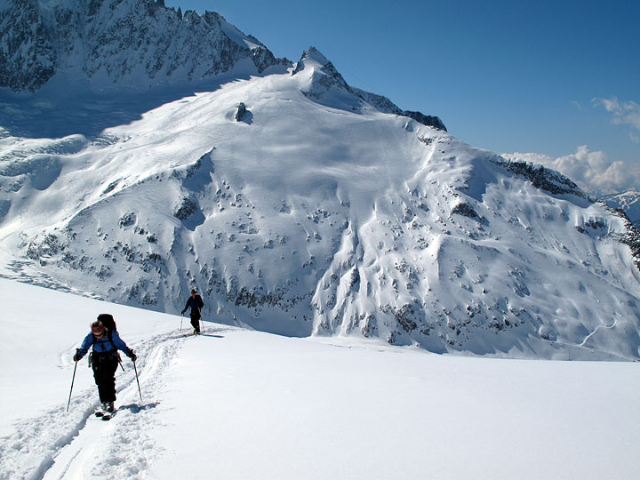 Beginning with a descent just off piste, from the top station of the Grands Montets, we by-pass the climb to the Col du Chardonnet shown here, heading down glacier before starting our own uphill skinning session. |