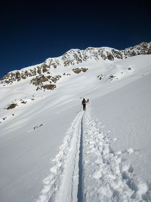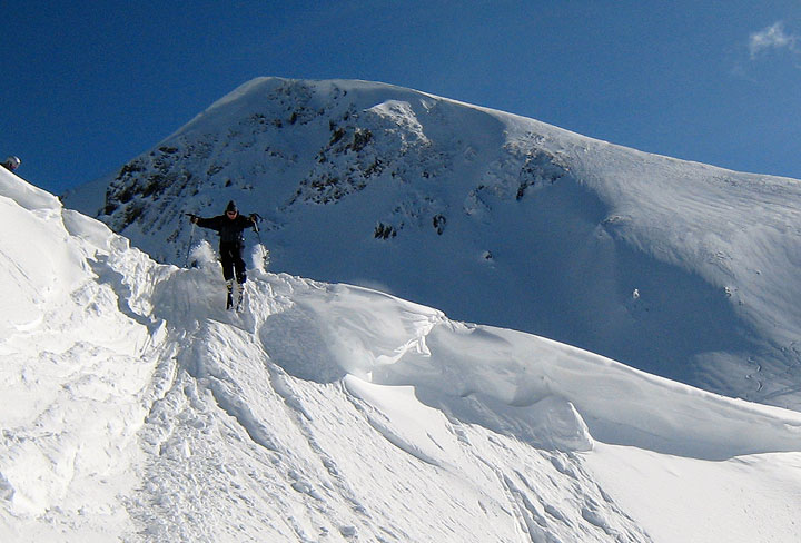 We had thought of maybe heading up to the Trient Glacier from here, but better snow appeared to await us below this point and the cold wind was freshening. |