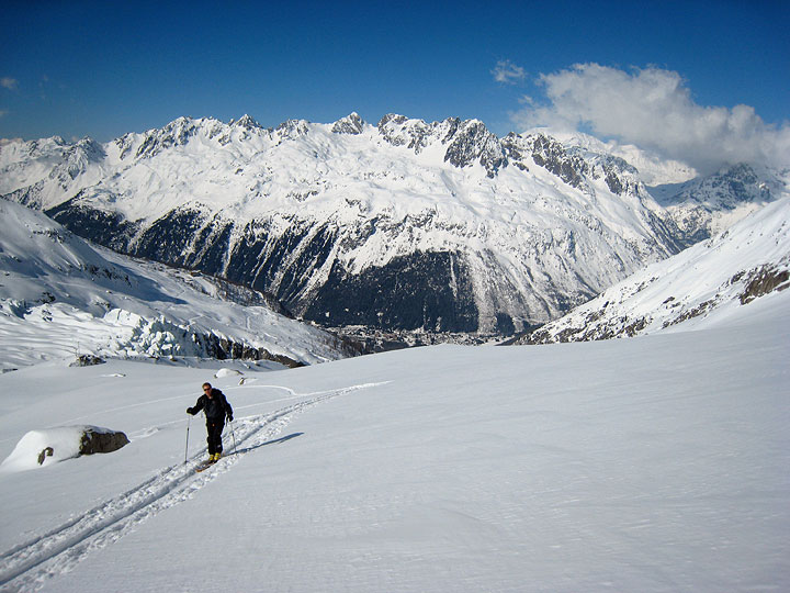 A long, though pleasant skin-up takes us to the base of the steep gully leading to the Col du Passon. In the background, the Grands Montets top lift and the glacier run we descended to get here. |