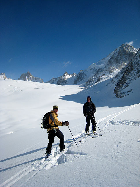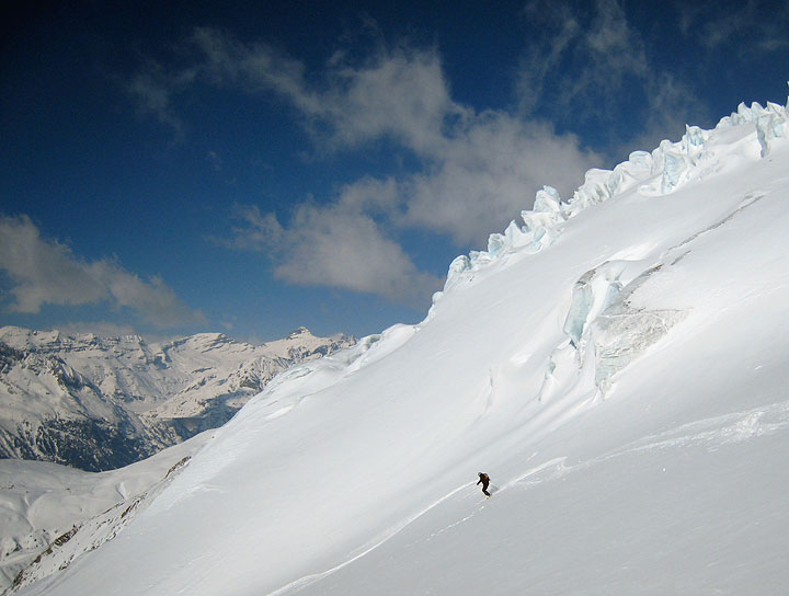 It was indeed very good snow! And very few tracks to constrain us. Wade enjoys a wind-sheltered slope beside the seracs of the Le Tour glacier. |