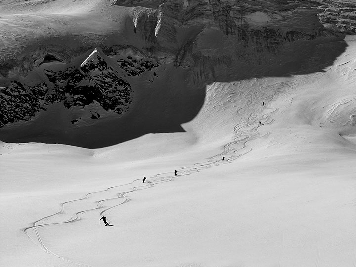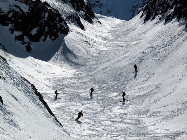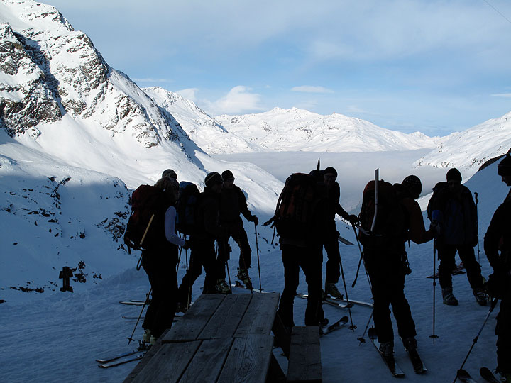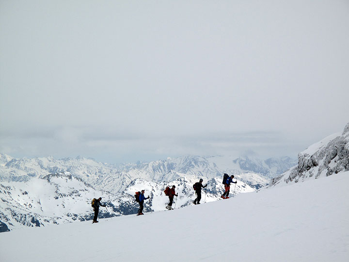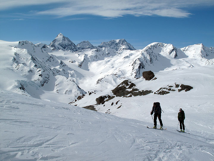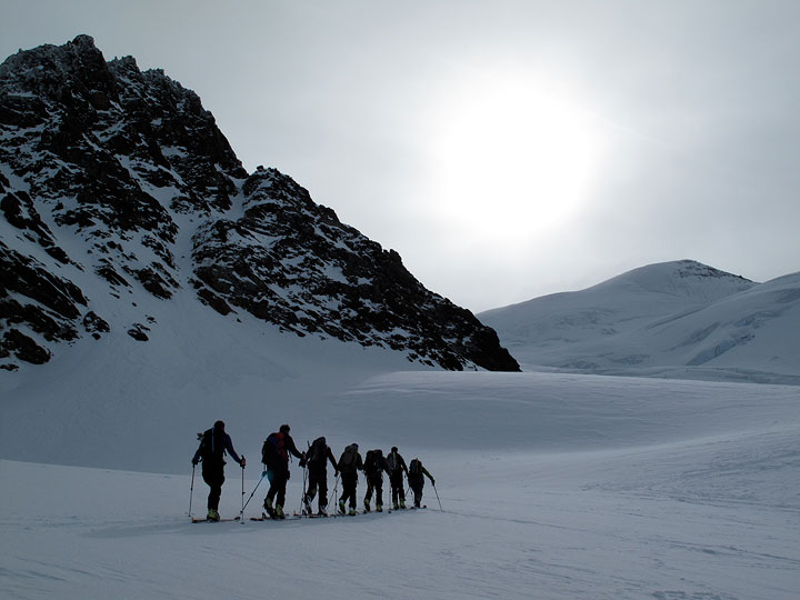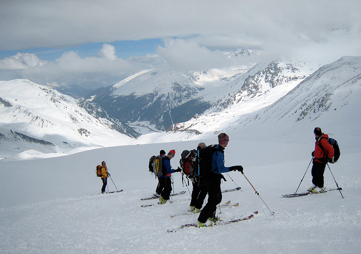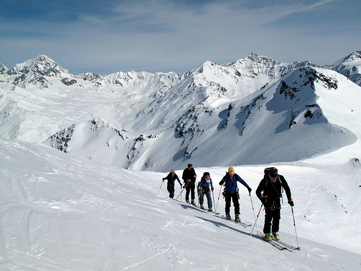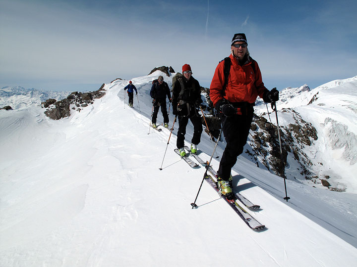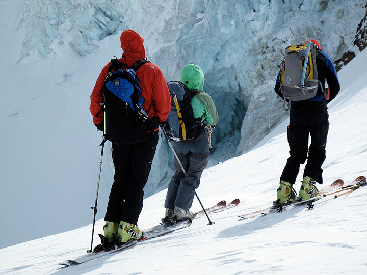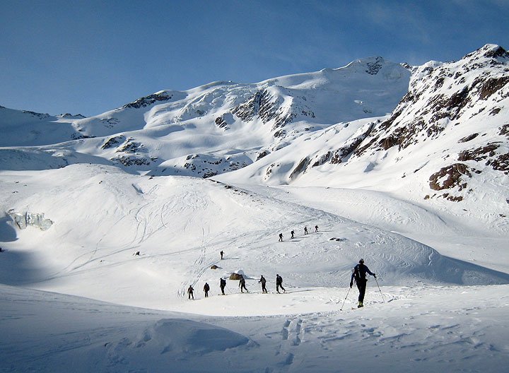 Our last day dawned clear as we headed back toward Sulden. Here we pause to boot up the steep slopes below the Casati hut. |
