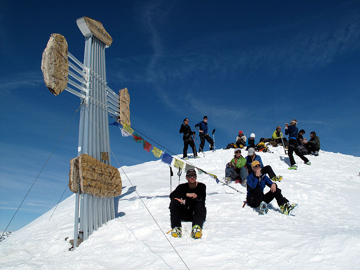 We topped out with another group and enjoyed some warm sunshine in the lee of the summit. |