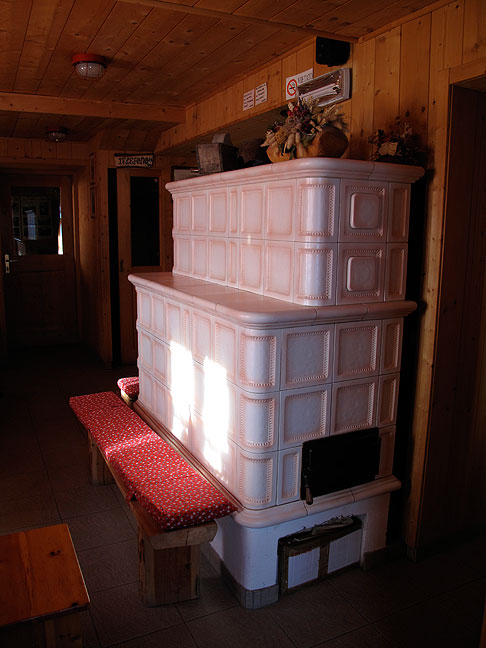 The crankin' hot tile stove is kept stoked from early morning by the senior hut-keeper, Mr. Alberti. |