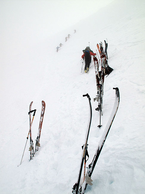 In the fog, we unexpectedly met some friends from the U.S. as we cached our skis for the steep headwall and ridge of Cevedale. |
