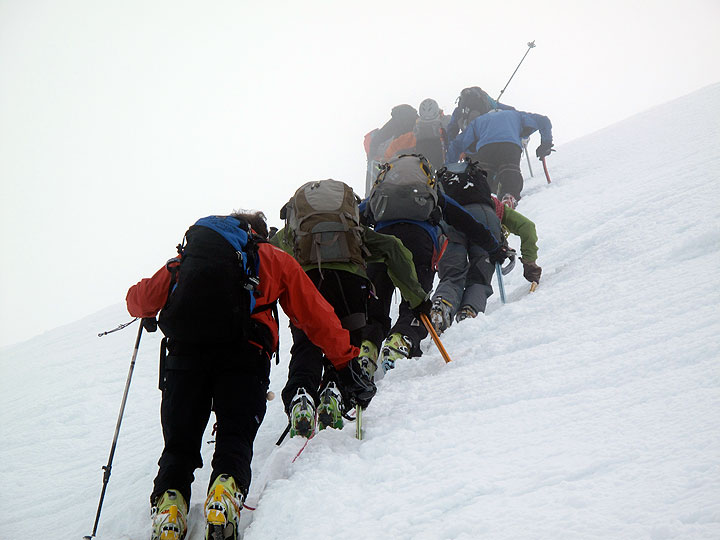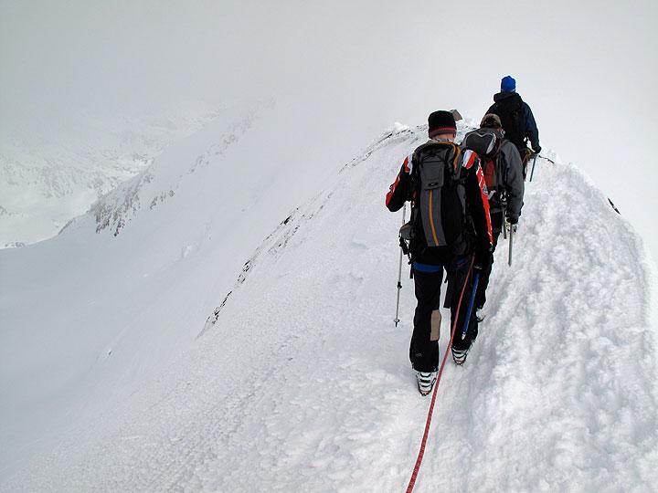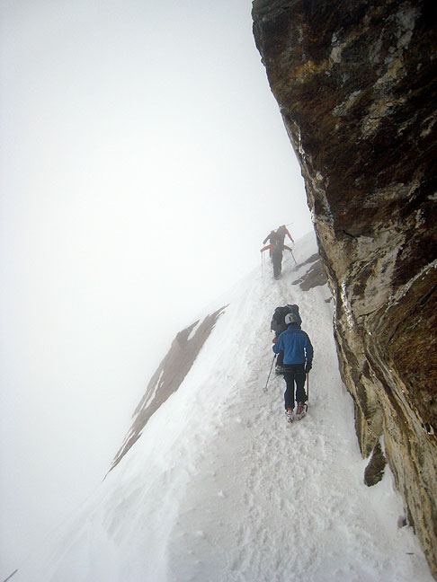 Continuing up the summit ridge, we follow our friends through the fog. |