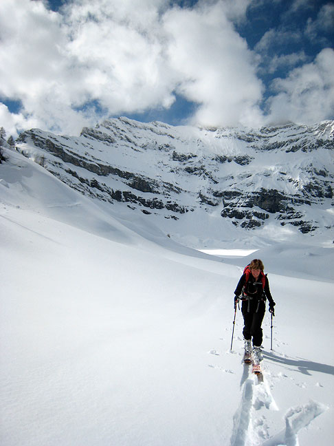 Monica heads up the steep slopes below the Col des Crochues. |