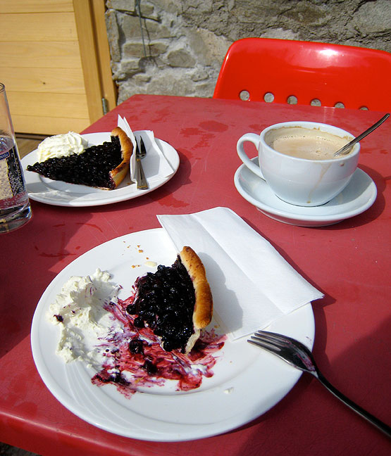 We stopped for a coffee and tarte at the charming refuge at Van d'en Bas. The hut itself is rustic and beautifully kept up, but Kathy obviously had eyes only for her half-demolished blueberry tarte! |