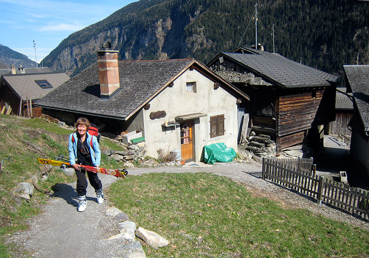 Shortly below the hut we ran out of snow, but were given a lift down the road to Tretien by a local skier/speed rider who had flown above our heads as we skied out! |