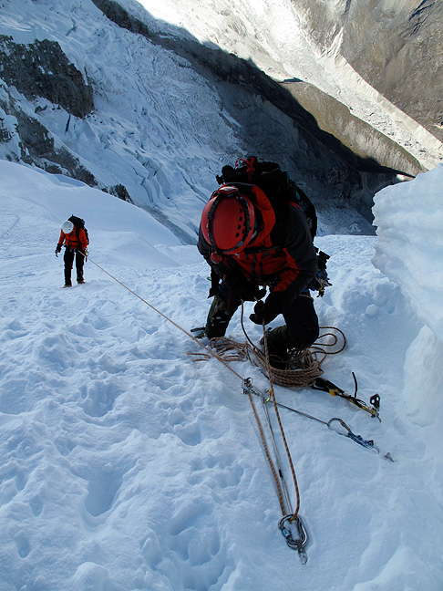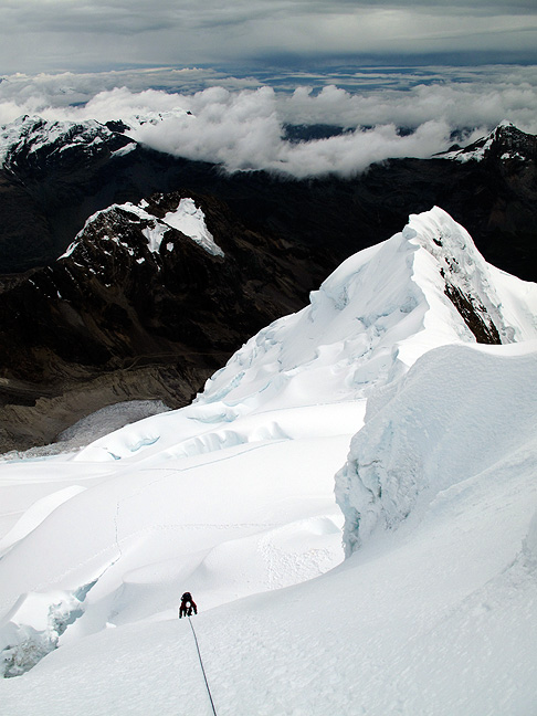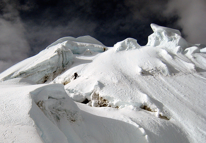 The following morning we had a great climb up interesting technical steps separated by wandering glacier climbing around lots of scenic crevasses and seracs. This shot is looking down the final belayed pitches to the summit. |