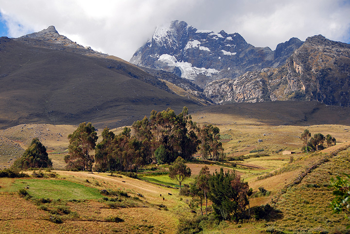 Our first day after arriving in Huaraz, we generally spend acclimatizing by hiking up to the scenic Laguna Churup. The laguna lies near the base of this peak, Nevado Churup, in a stony basin below the little glacier seen here. This photo is taken on the drive to the trailhead at Pitec, and shows cultivated fields at about as high an elevation as one can reasonably plant crops. |