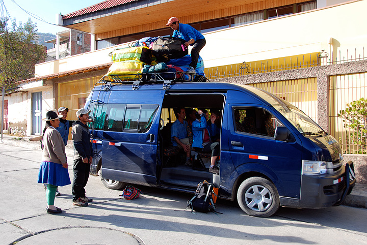 Here we are loading up our gear into and onto the van in Huaraz. |