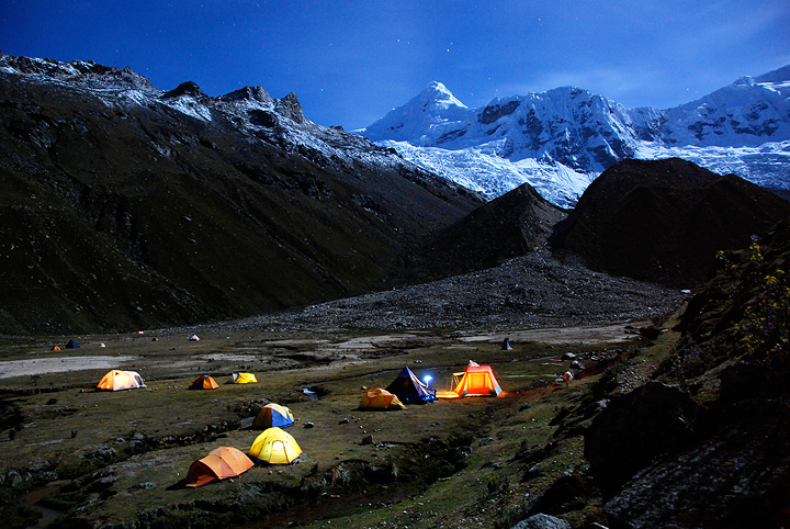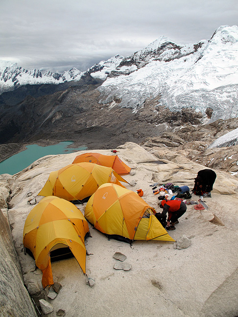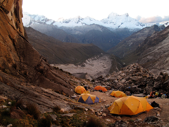 Our moraine camp has beautiful views across to Chacraraju and Pisco Oeste. |
