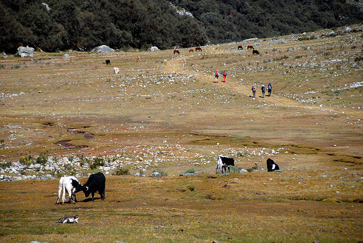 Some local livestock handlers were taking a couple of apparently fierce bulls down from their high pastures to the village. They weren't taking any chances—each bull had four adult men controlling its movements by means of long stout ropes. These guys clearly did not want to get close to the animal, nor risk it getting away. Their tone of voice as they shouted at us to get out of the way expressed their mistrust of these "bravo" bulls. |
