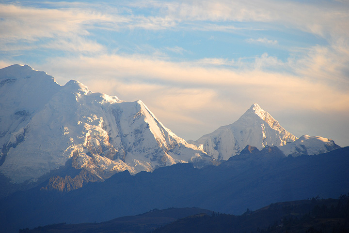 Our final goal is Chopicalqui, shown here as seen from our hotel room balcony. Huascaran is the big bruiser looming on the left. |