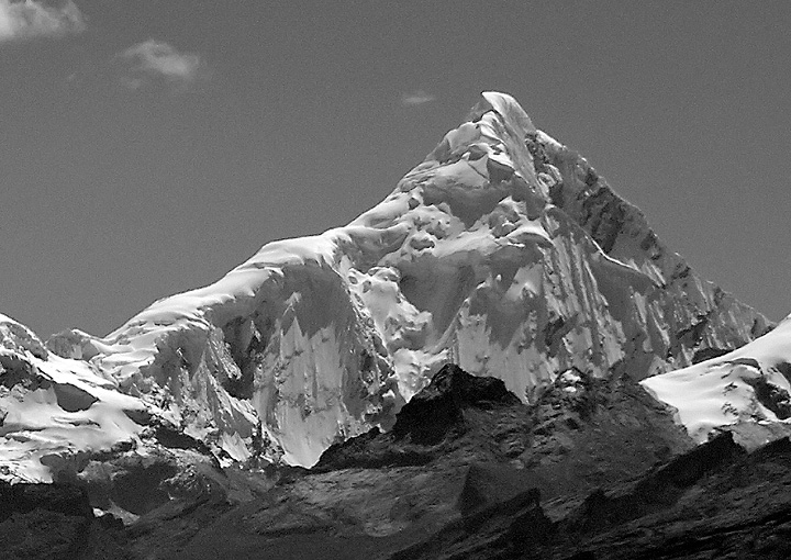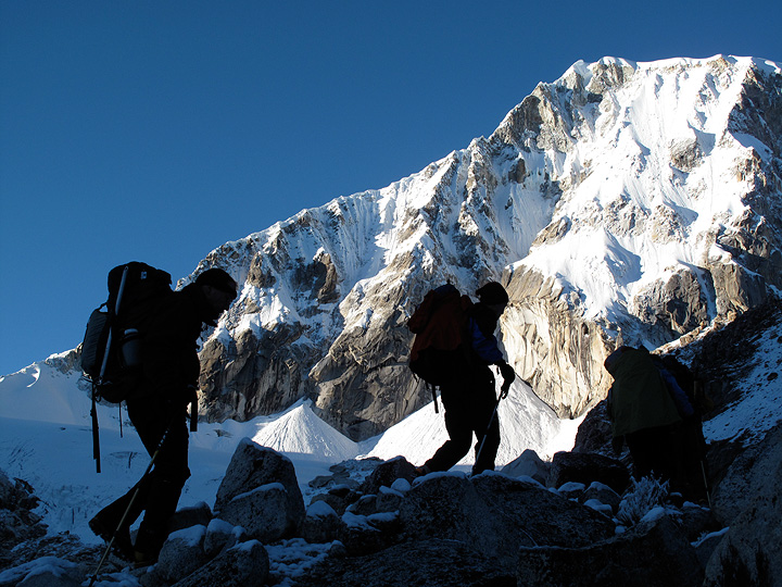 Our first climb was of Ishinca. We started hiking in the pre-dawn darkness, and sunrise found us near the moraine below Ranrapalca. |