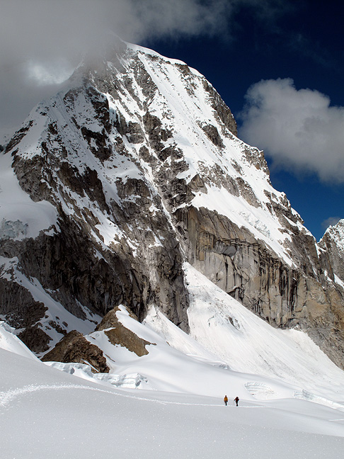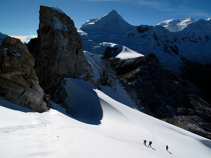 Urus Este was our next climb, we're wending our way up the glacier here below the rocky summit pyramid. Tocllaraju is the pointy peak in the background, with Palcaraju's east summit further away on the far right. |