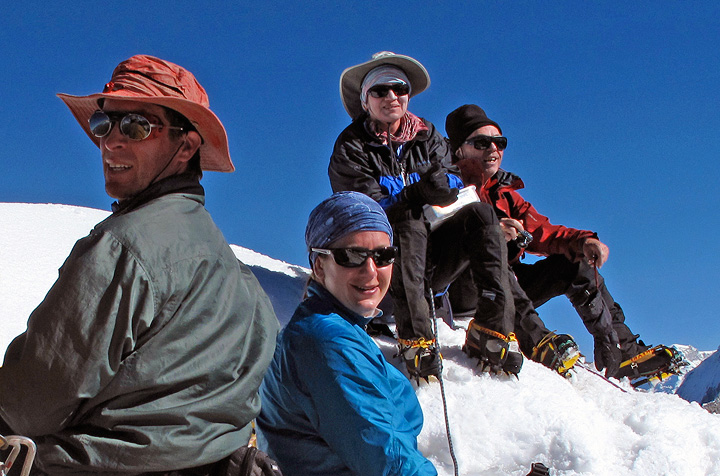 From left to right as they perch on the summit of Urus Este are: Ed and Melanie Sneddon from the UK; Susan Lowery from CT, and Jim Manning from PA. |