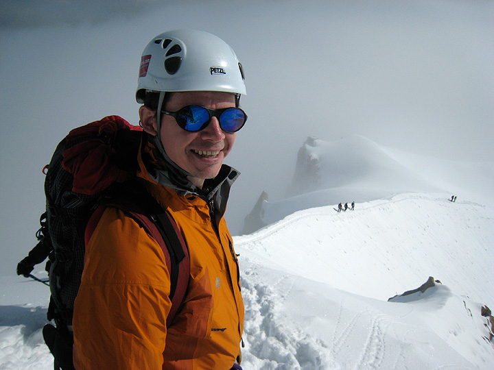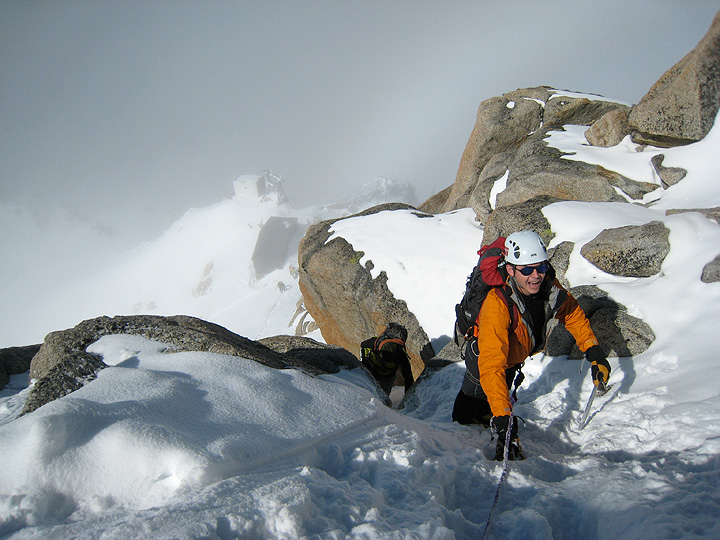 Peter Barry, who calls Connecticut home, was visiting relatives in Nice, France, and decided to get in a bit of climbing. For the few days prior to his arrival, the weather had been decidedly difficult, but on this particular day, we just managed to get above the clouds. Our original plan of the Pyramid du Tacul was covered in new snow, but the Arête des Cosmiques was in fun condition. |